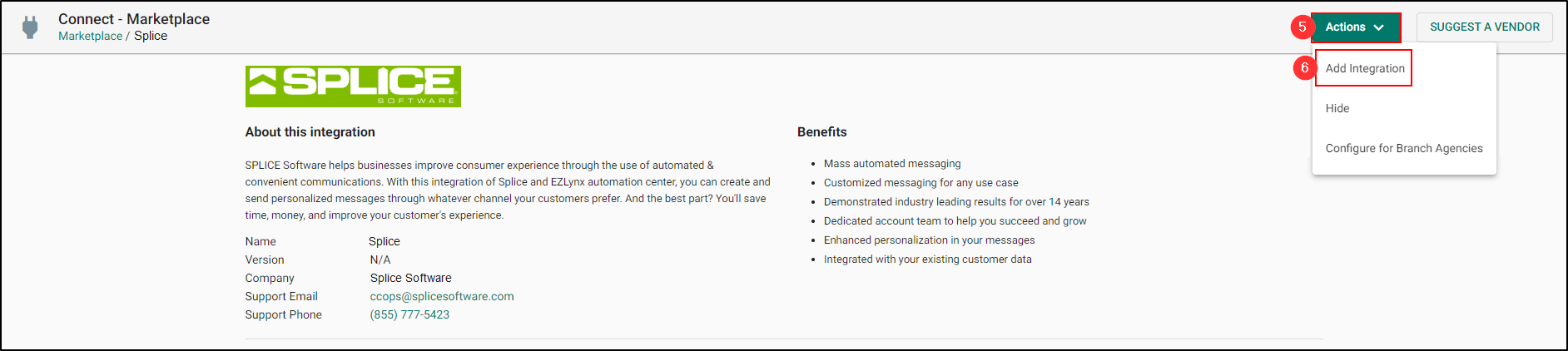 From inside the SPLICE Integration page, click the Actions button. Then, click Add Integration.