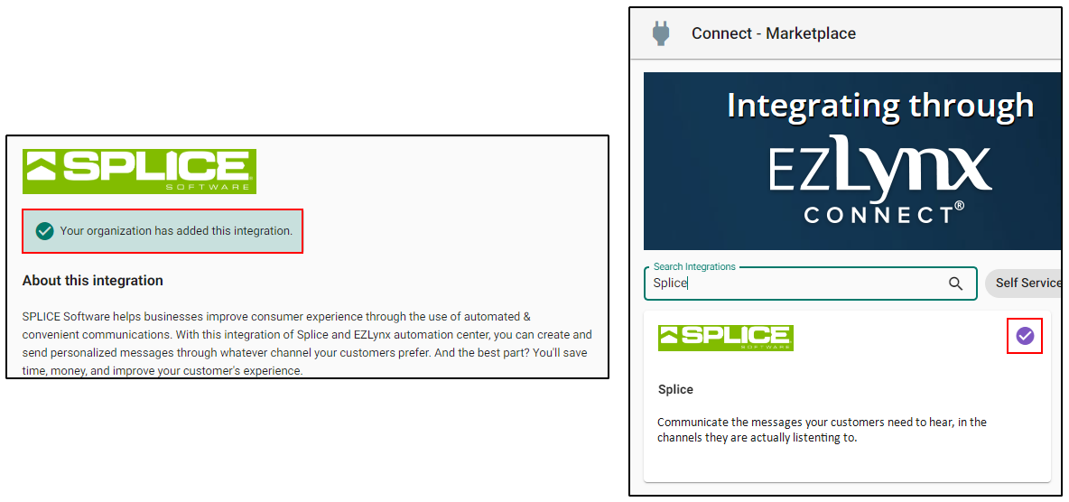 The page will reload, and you should see a green message stating that the integration was added. Back in the Connect home page, you should also see a checkmark on the SPLICE card indicating this is enabled for your account.
