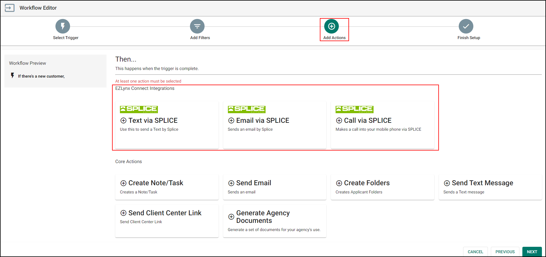 These SPLICE actions are under the EZLynx Connect Integrations section while the other pre-existing EZLynx actions can be found under the Core Actions section.