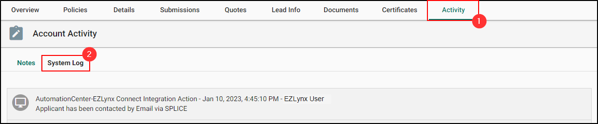 Once a workflow is successfully triggered, you can see a system activity in the system log of a customer's account. This will help you to understand what actions were executed. The header of the system log would be "Automation Center-EZLynx Connect Integration Action -" followed by the date and time the action was completed, and the user that made the automation workflow.