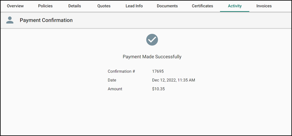 You can also see confirmation information under the Activity tab when you make this sort of transaction. You'll be able to see the customer's name, email address, premium amount, who made the payment, payment confirmation #, and the payment description.