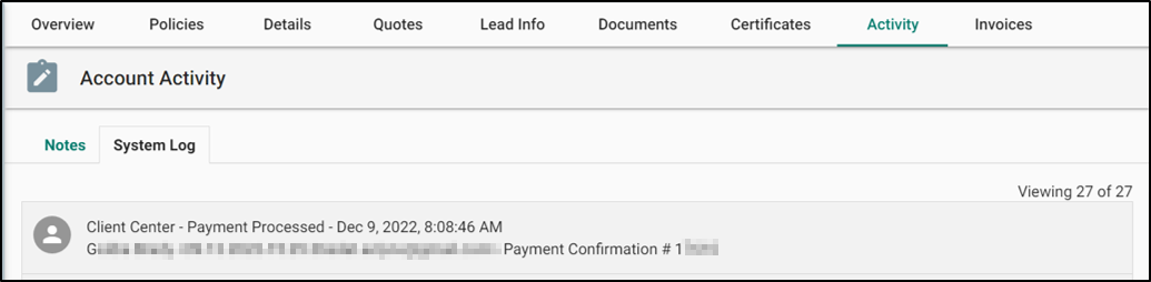 Finally, you can also confirm the payment processed under the System Log. There you will see payments details under the message displayed "Payment Processed - Date and Payment Confirmation #".
