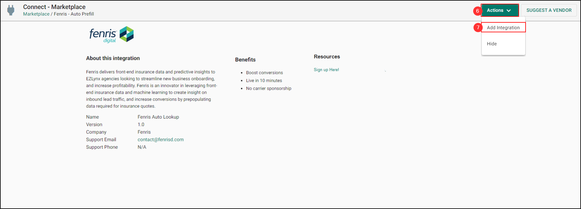 To enable the integration for your agency, click the Actions button on the top right corner and then click Add Integration.