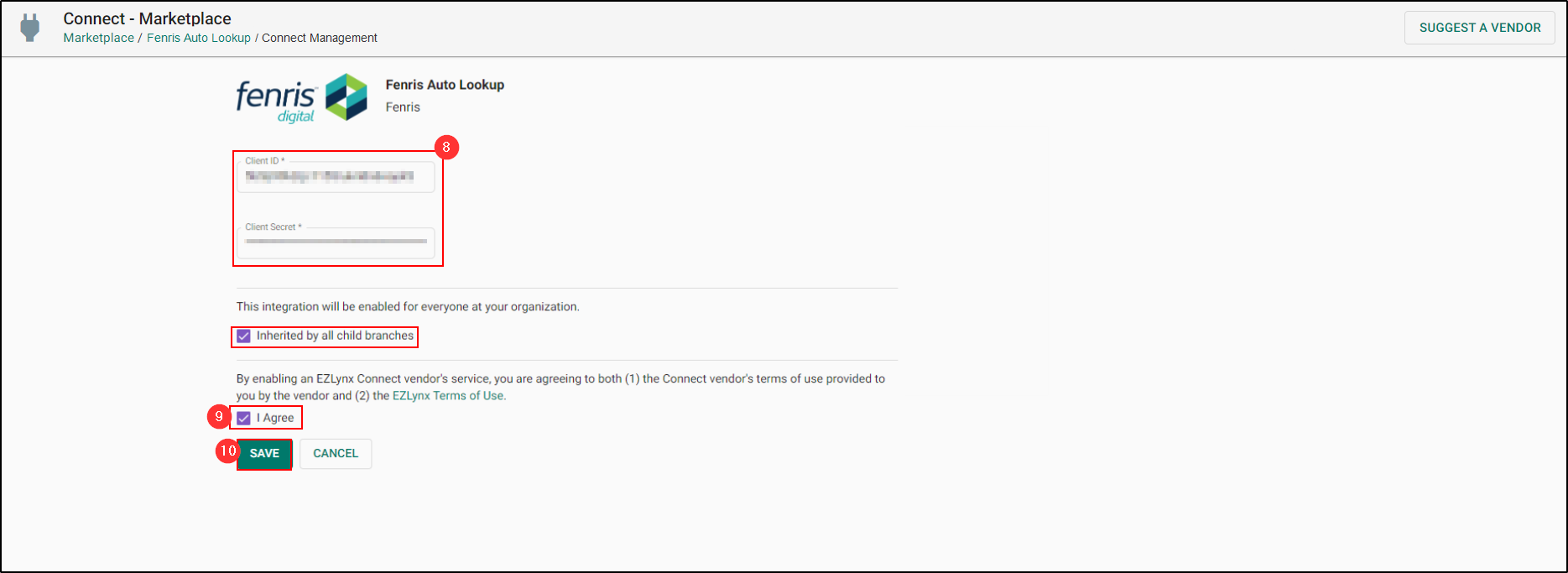 Next, enter the ClientID and Client Secret for your Fenris account. This information is provided by Fenris. EZLynx will not have this information as your account is directly with Fenris for this service.