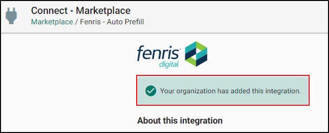 Once the Setup Process is complete, you should see a message on the integration details page that says "Your organization has added this integration." You should also see a purple check-mark on the Fenris Integration Card if you go back to the Connect Marketplace homepage.