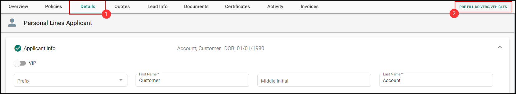 To access the Fenris Pre-fill Workflow from an existing applicant, you will go to the account's Details tab and click the Pre-fill Drivers/Vehicles button on the top right of the screen.