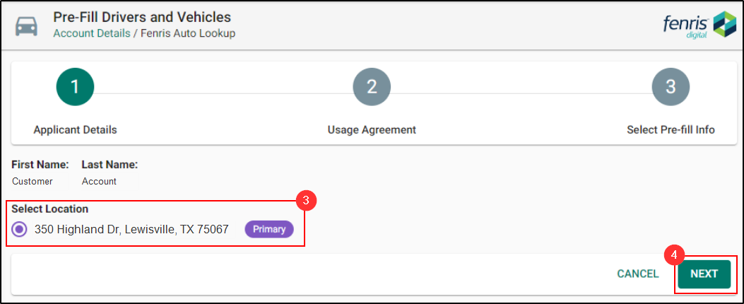 If you access the Fenris Pre-Fill Workflow from an existing account or from the Auto Rating Application, you will have the chance to review the location of the account.