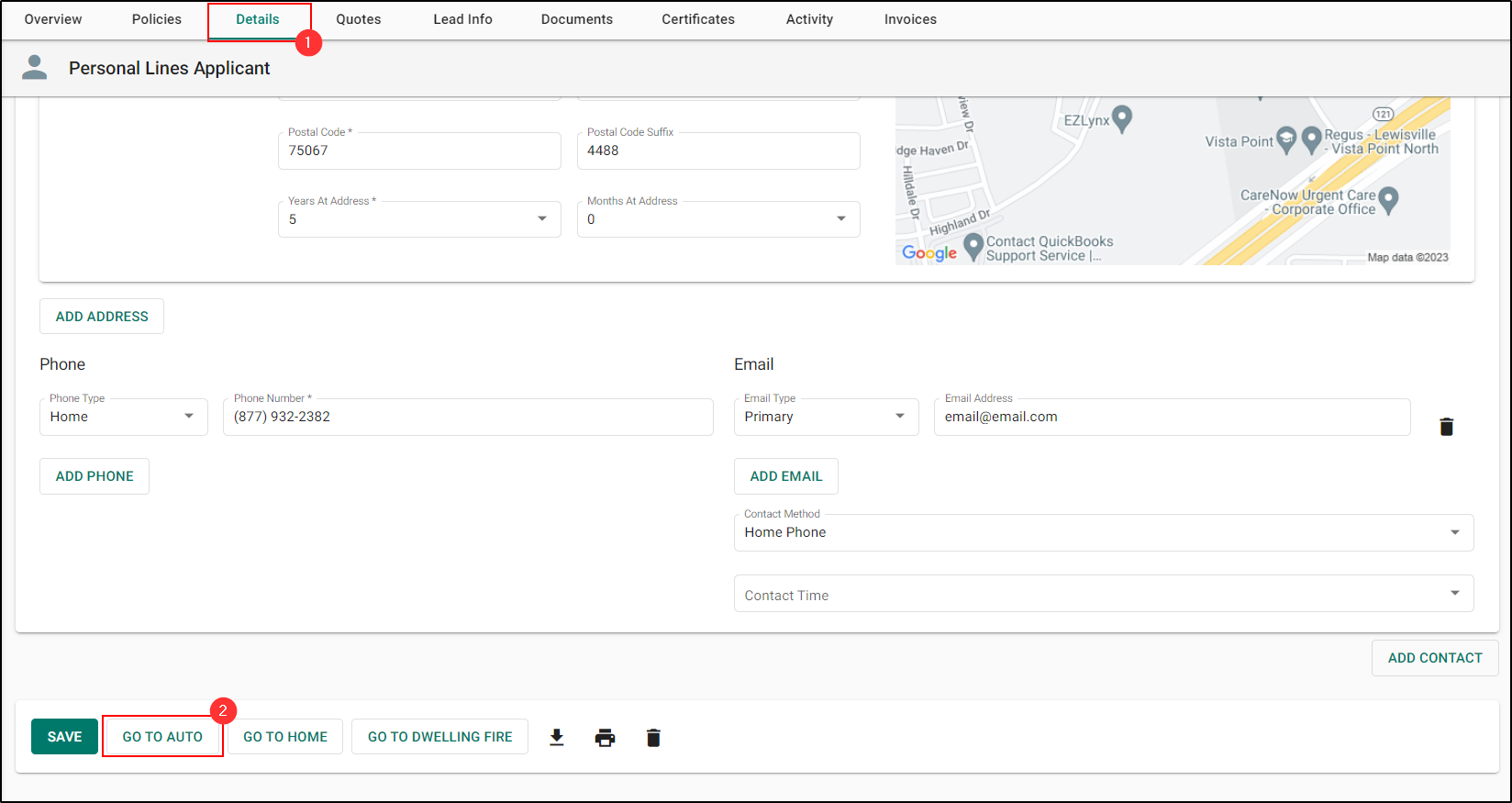 The information will get added to the Auto Rating Application for the account. If you did not access the Pre-Fill Workflow from the Auto Rating Application, you can view this information by selecting Go To Auto on the bottom of the Details tab and clicking on the Drivers or Vehicles sections.