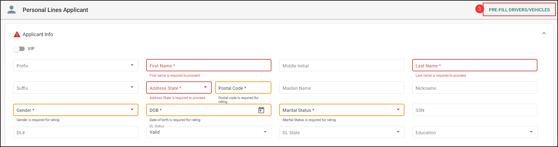 On the Personal Lines Applicant page, click the Pre-Fill Drivers/Vehicles button on the top right of the screen.