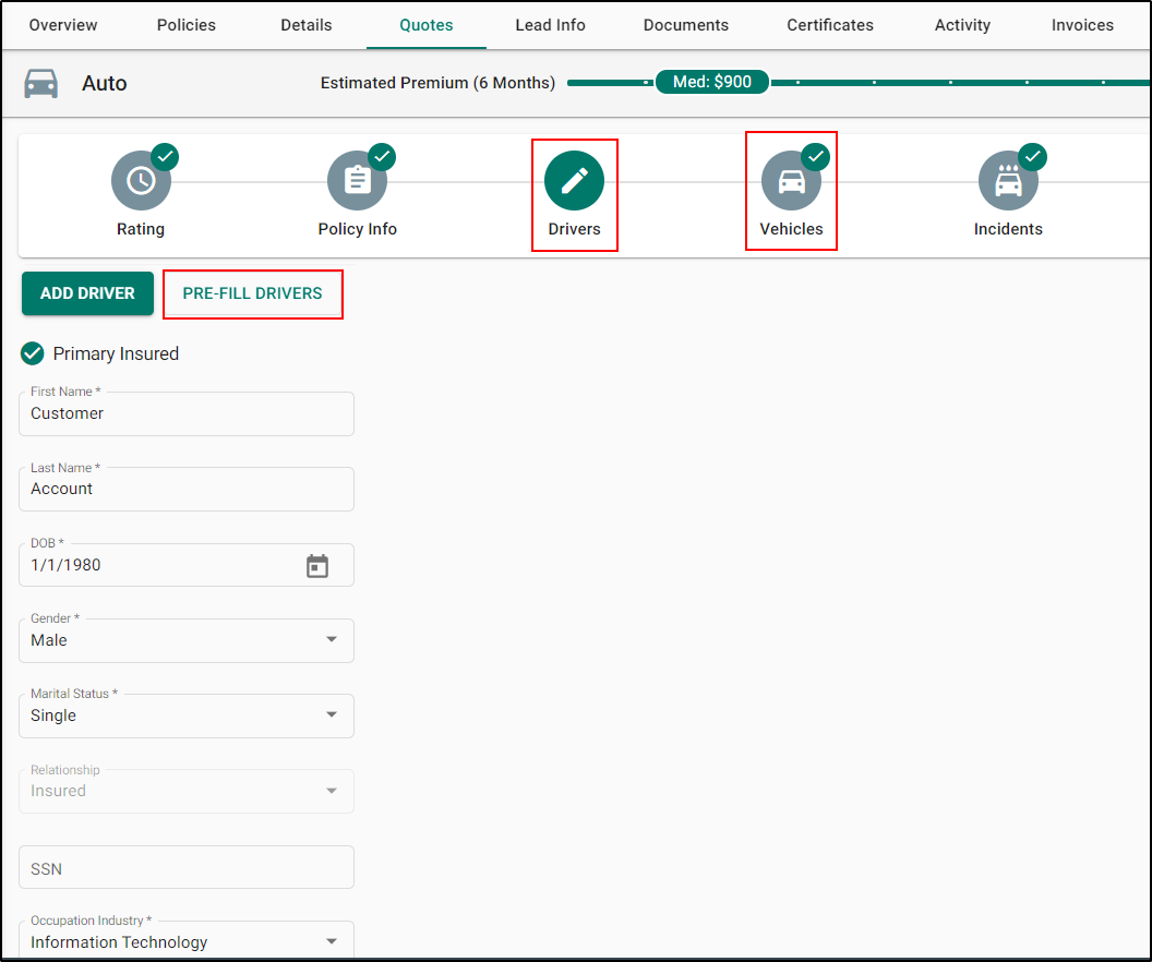 However, you get into the Auto Rating Application, you will find the Pre-Fill Drivers button on the Drivers section and the Pre-Fill Vehicles button on the Vehicles section.