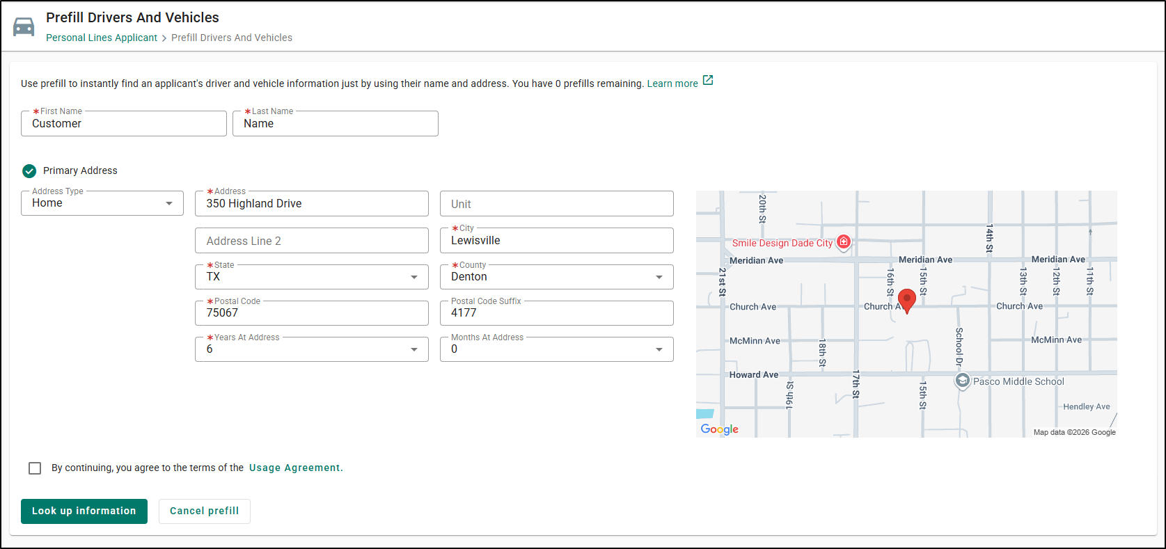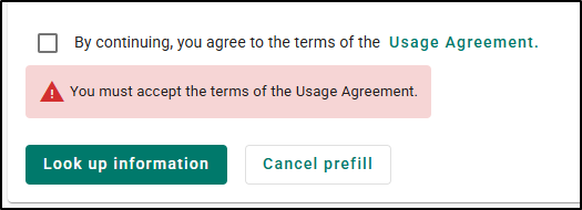 You will need to agree to the ‘Usage Agreement’ before you can perform the prefill lookup. If you try to do the lookup without agreeing, a warning message explains why you cannot move forward. Once you have check marked "I Agree", click the Look up information button.