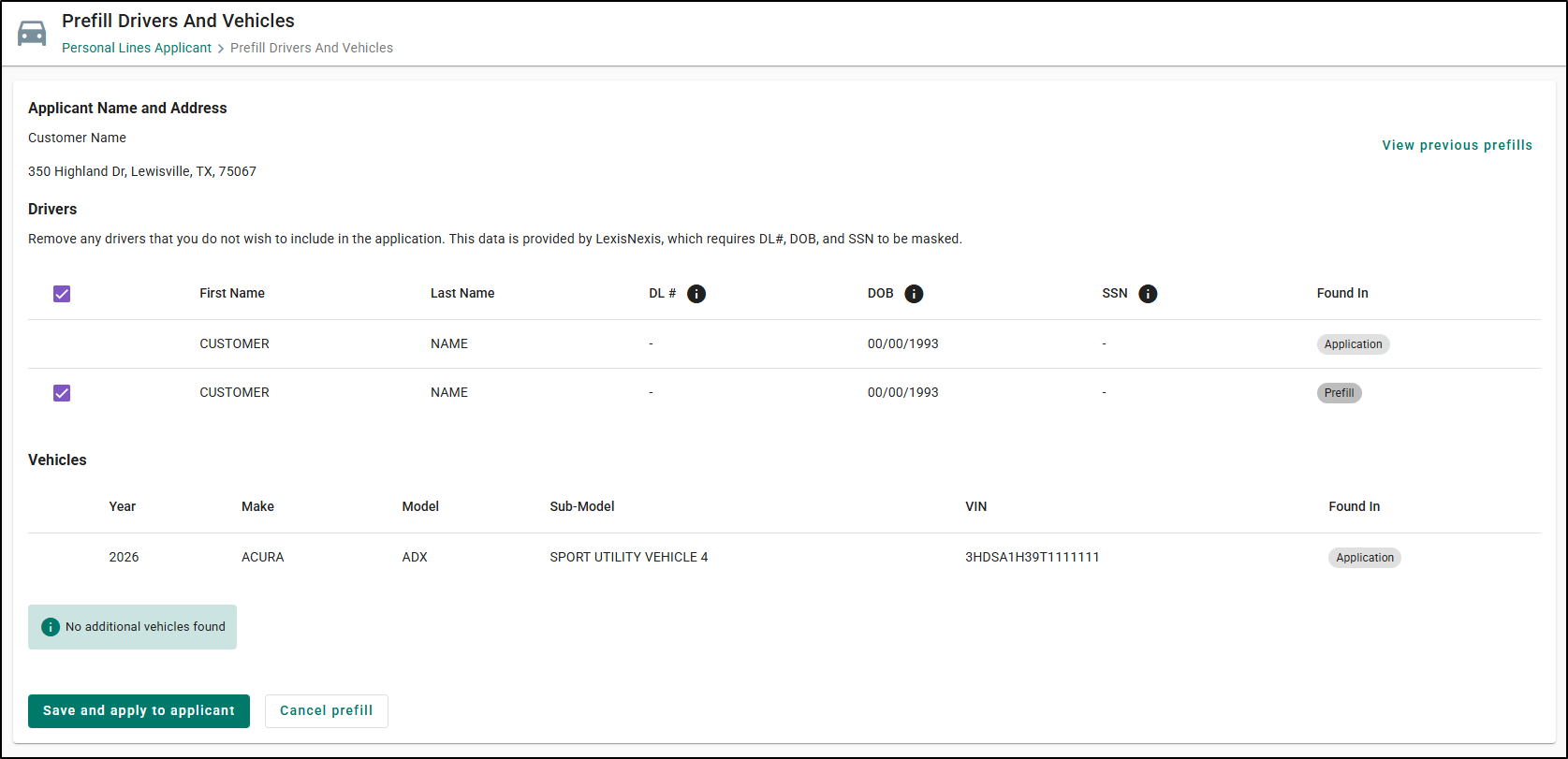 Next, you will have a chance to review the pre-fill details. At the top of the page, you will find the address that was selected on the earlier step as well as the drivers that were found in the completed search. Please note, Fenris will not be providing the SSN or DL for applicants through the data enrichment process. If you wish to add the additional drivers to the account, you will simply check the drivers available.
