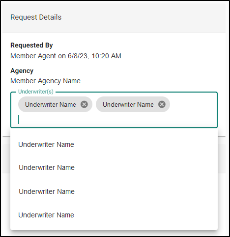 If you need to assign additional Underwriters or change whom the request is assigned to, you can click into the Underwriter(s) field and type in the name of the Underwriter that needs to be assigned. To remove an Underwriter from this field, click the x button next to their name. There must always be at least one Underwriter assigned to an Underwriter request.