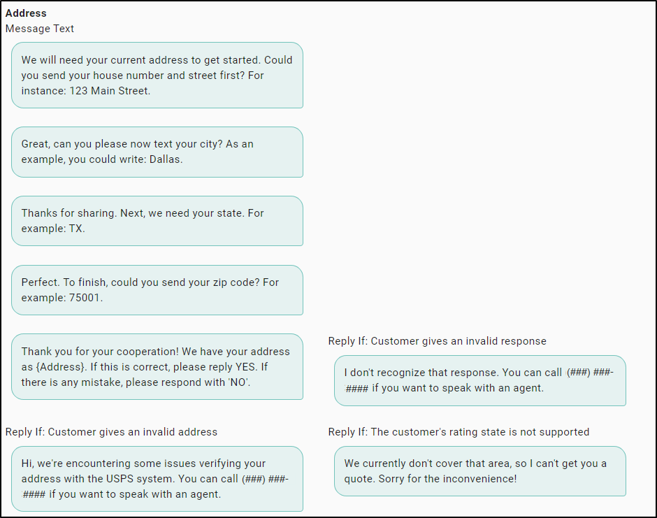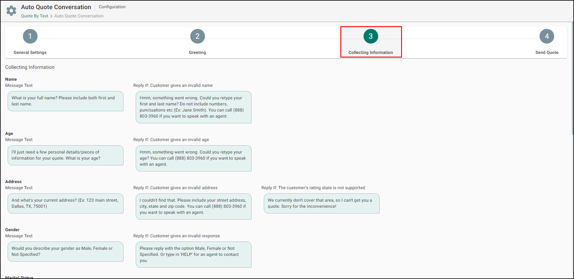 Below are the different areas of information gathering. Please take note of the messages that are indicated to be for Quote By Text only. This means they are not included when using Quote By Text for a Lead Capture Service.