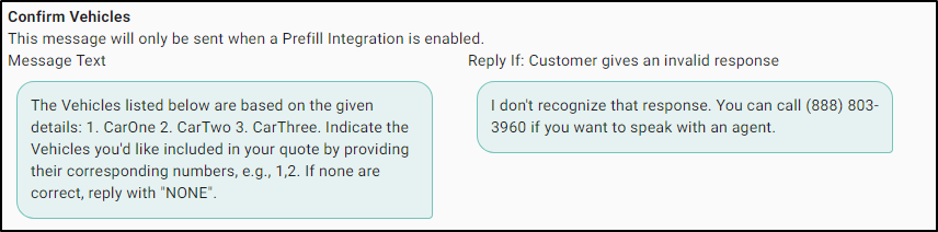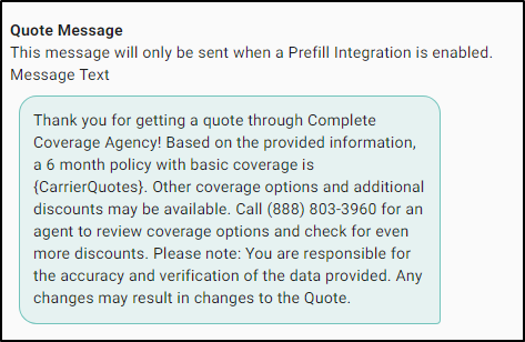 When sending the quote, the system will choose the three lowest quotes that come back from the carriers listed on your Quote Template and relay those back to the customer in ascending order. If there are carriers that do not supply quotes, they will not be considered for the message. For example, a rate that comes back from Travelers would be received as “$943.29 with Travelers” within the message. Please note that this will only be sent when a Prefill integration is enabled, and the settings are set to Quote By Text.
