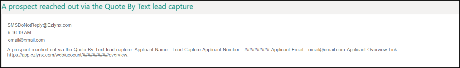 Lead capture notifications will come to you via email and Workspace. The email notification will provide you with the Prospect Name, Number they texted from, Email Address they provided and a link to their Applicant Overview in the system.