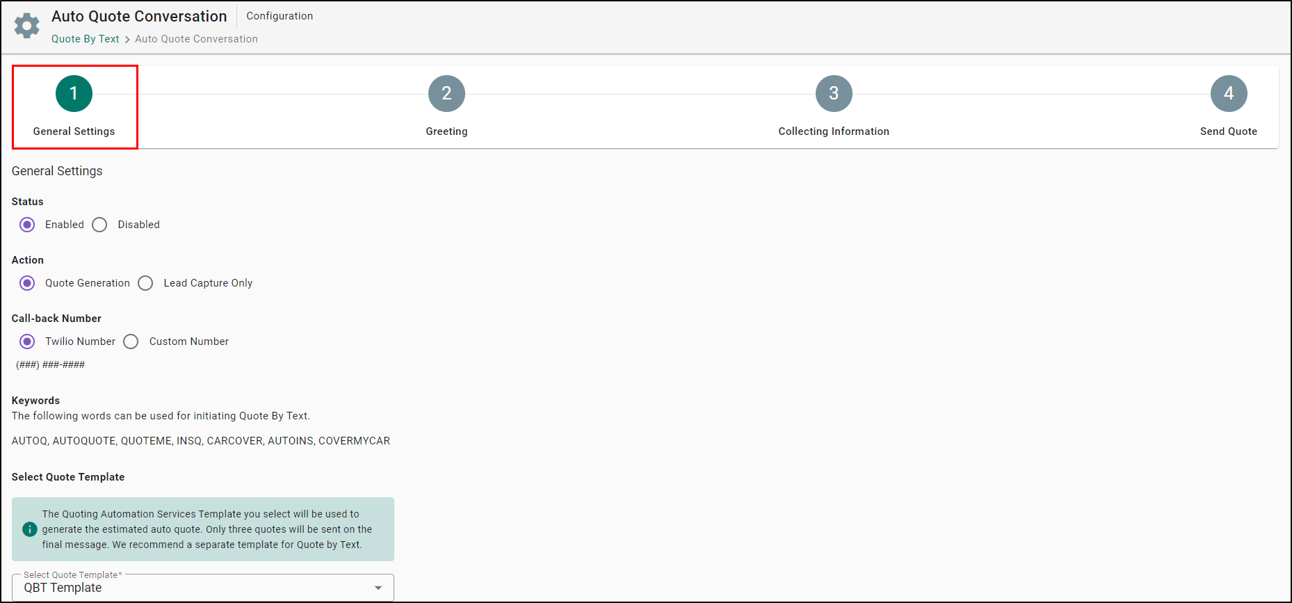 On the Quote by Text Settings page, you will see a card for Auto Conversation. This is where you can confirm the number your insureds and prospects will be texting the provide keywords to initiate the process. Select the card to get into the Auto Conversation Configuration page.