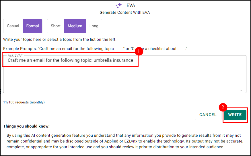Now that you've decided the tone and length, we need to come up with the prompt. Simply provide a few keywords for the topic you want EVA to write about, or type in a request as if you’re chatting with a coworker. We’ve also provided some example prompts to help you keep it simple (e.g., “Craft me an email for the following topic____." or "Create a checklist about_____.") When you’re ready, click the Write button and let EVA do the rest.