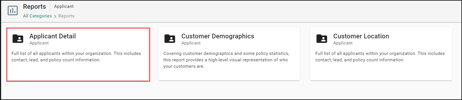 Once on the respective category's page, select one of the report cards to open that particular report. Each card has a quick summary of what you can expect to find data wise. We are going to use Applicant Detail for our example.