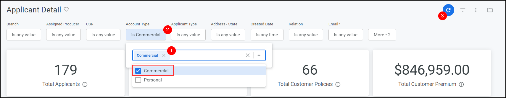 To apply the filter, select the blue reload button, and the report will refresh and apply the filter.