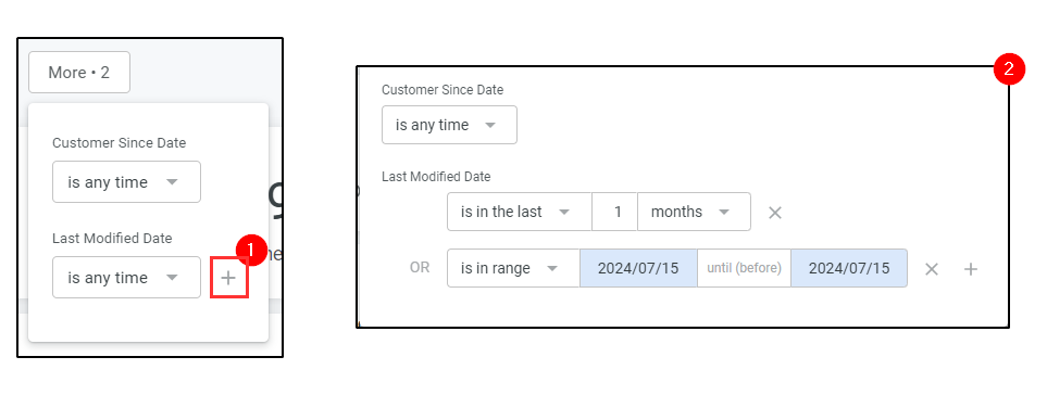 Some date filters allow you to add multiple timeframes. To tell if the filter allows for it or not, look for the "+" icon. Using the Applicant Detail as an example, you'll notice the Customer Since Date does not allow for multiple timeframes while the Last Modified Date does.
