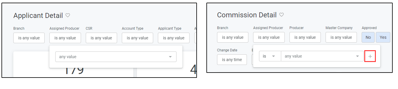 Some value filters allow you to add multiple criteria. To tell if the filter allows for it or not, look for the "+" icon. Using the Applicant Detail and Commission Detail reports as a comparison you'll notice the Applicant Detail Assigned Producer does not allow for multiple criteria while the Commission Detail Assigned Producer does.