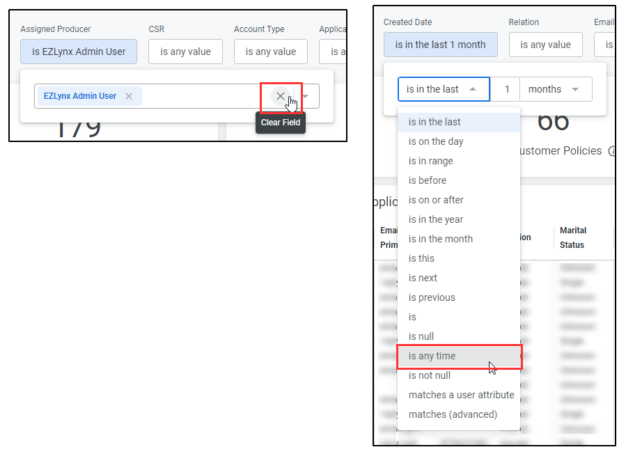 | Is | This filter allows complex time period selections. It enables specifying a range of time by selecting a number of time increments (like days, weeks), a time unit (like seconds, months) and a direction (like 'ago' or 'from now'), and then defining an extended period. | To track policies that were initiated 3 months ago and cover the subsequent 3-month period, use 'is 3 months ago for 3 months'. This is particularly useful for reviewing policy performance or client engagement over a specific quarter. |