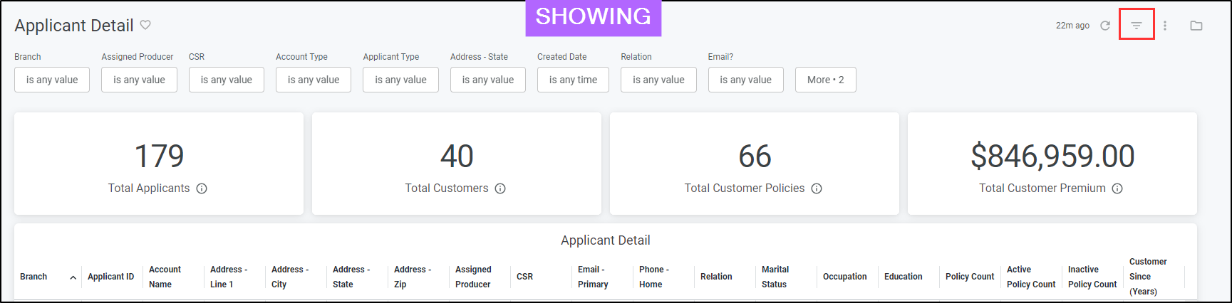 To create a filter set, apply the filters to the report like normal. For example, adding an Account Type filter to Personal Lines accounts and then follow the steps below.