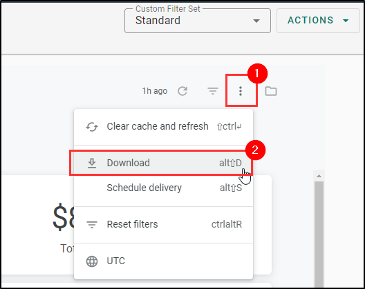 To download the report as a whole, select the three vertical dots in the top right corner to open the menu. Then, choose Download or press the hotkey Alt + D. A pop-up will appear that allows you to choose how you want to download the report.