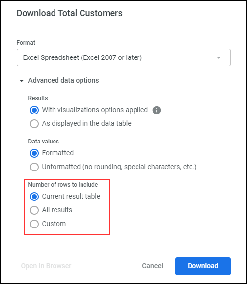 - Custom can be used to export up to 5k rows if you do not have the expanded download permission.