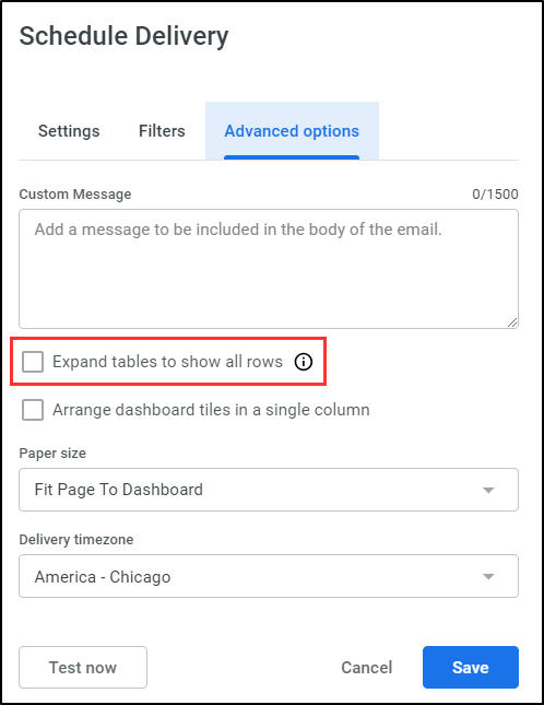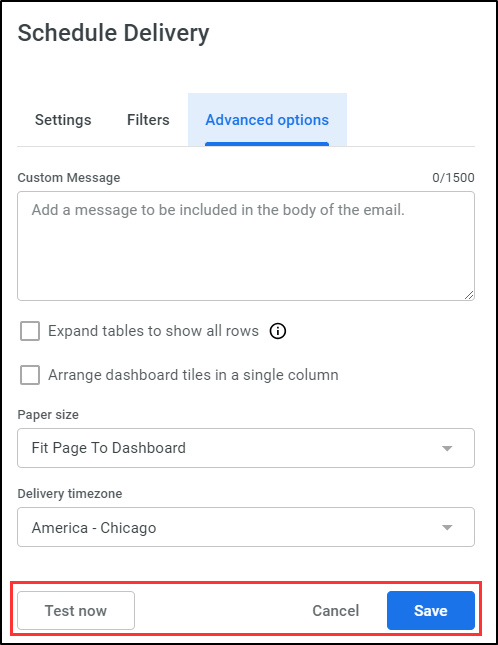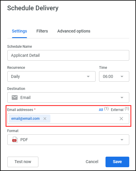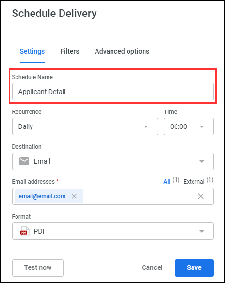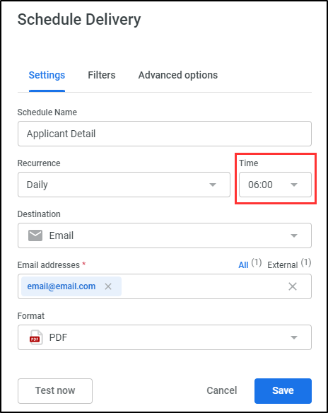 - Test now: Before finalizing the schedule, choose Test now to send a test email to yourself or a designated email address. This allows you to preview how the scheduled report will look when delivered.