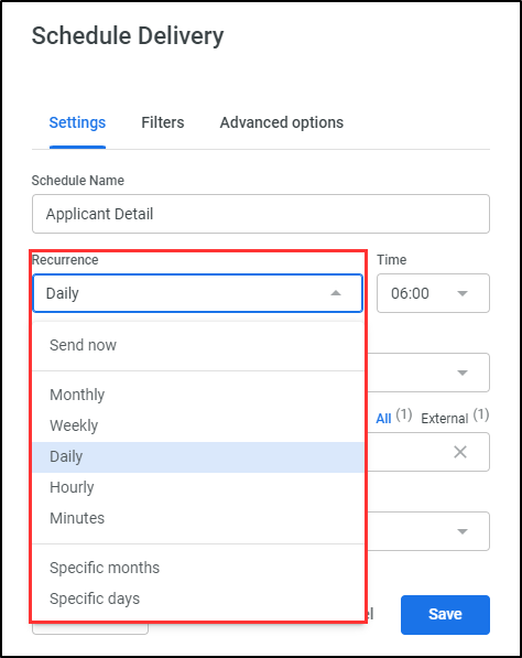 2. Recurrence: Select the desired recurrence for the report delivery. You can choose from daily, weekly, monthly, hourly, minutes, specific months or specific days.