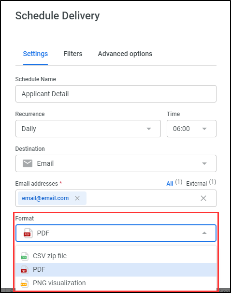 5. Delivery Formats: Choose the preferred delivery format for the report. Looker supports PDF, CSV in a zipped file or PNG visualization formats.