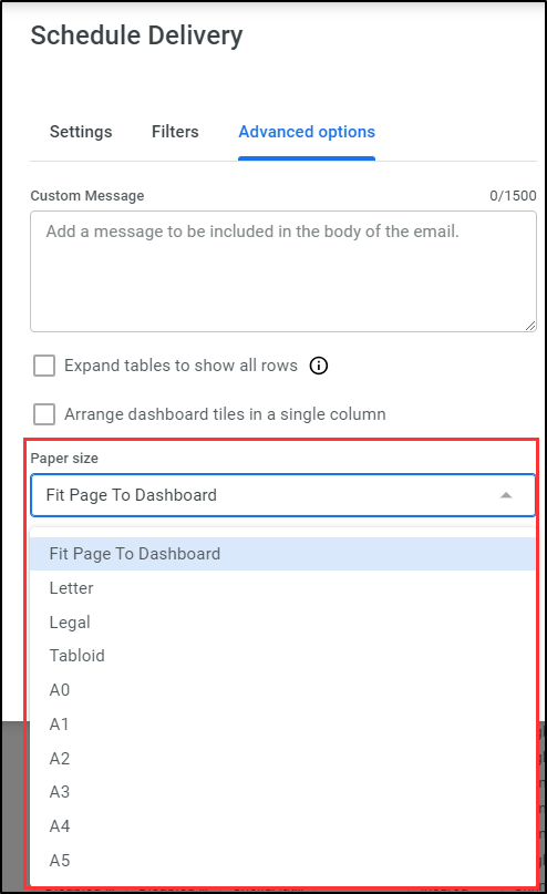 4. Paper Size Selection: Specify the paper size for the exported report. Options include fit page to dashboard, letter, legal, tabloid, A0, A1, A2, A3, A4, and A5.
