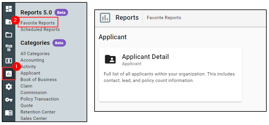 Reporting Menu - Hover over the reporting icon to open the Reporting Menu and choose Favorite Reports. This will take you to the Favorite Reports page.