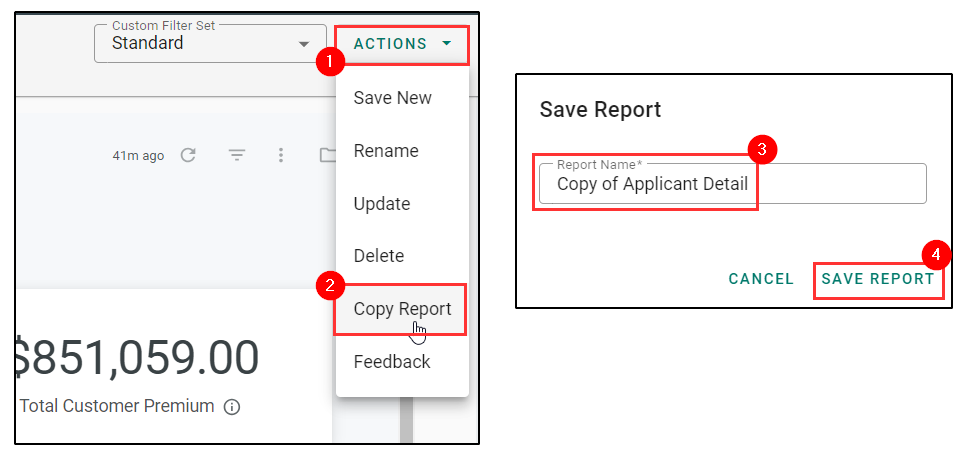 2. Name the report and select Save Report. This will create a new dashboard version after selecting Copy Report. The saved dashboard will contain all the same visualizations, data, and settings as the original dashboard.