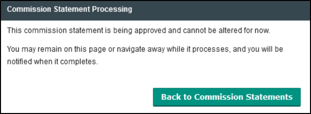 The messaging for processing Commission Statements is updated when 'Approve All' is selected or unselected. During the processing of the statement, an option will appear for the user to navigate away or remain on the statement page. The message will be removed once the statement has been processed. All notifications will be sent to the user who initiated the commission statement. The Commission Statement page will show the status of a processing statement.