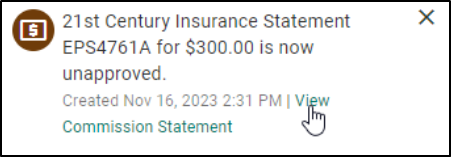 - The Agency Workspace Notification includes the status, carrier, commission statement number, commission statement amounts and a direct link to the Commission statement.