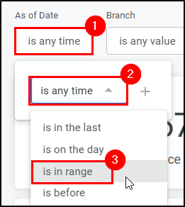 2. Select "is any time" to open the date type dropdown. This will let you customize the date filter.