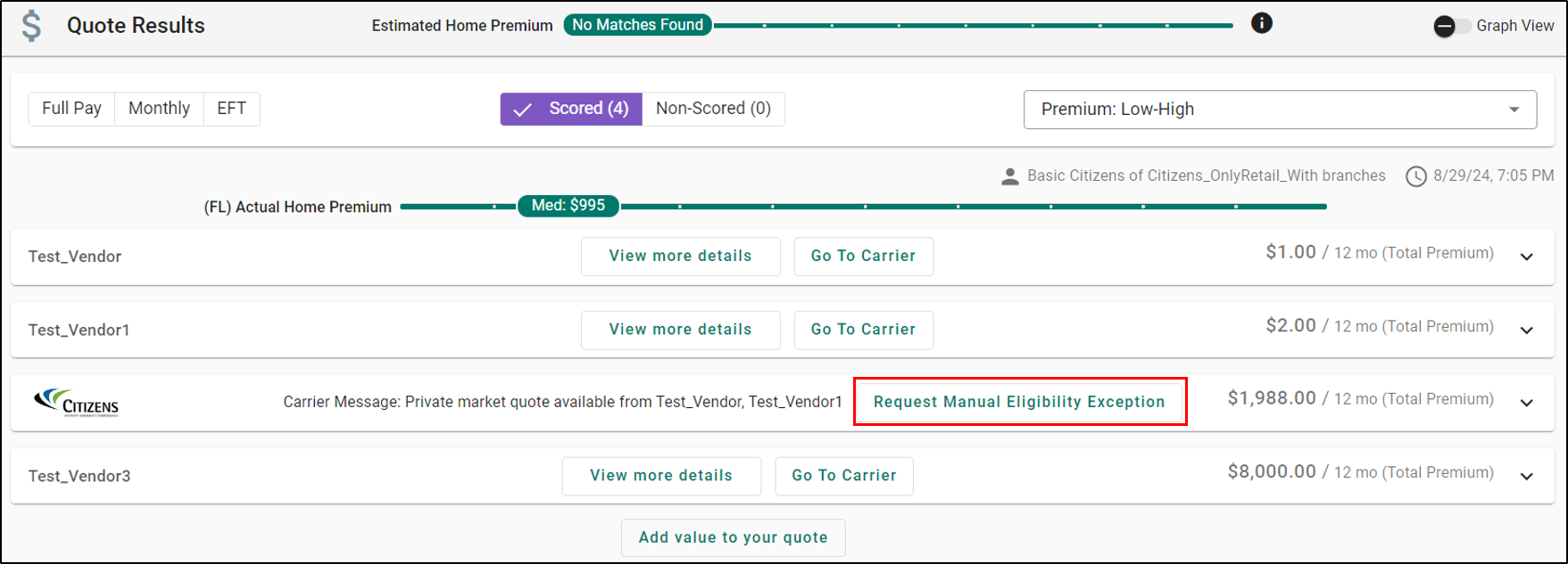 Once on the Quote Results page, if Citizens rejected the application, the returned premium from Citizens will be displayed along with the new Request Manual Eligibility Exception button. It will also include the names of the carriers that caused rejection of the Citizens quote due to ineligibility in the carrier message.