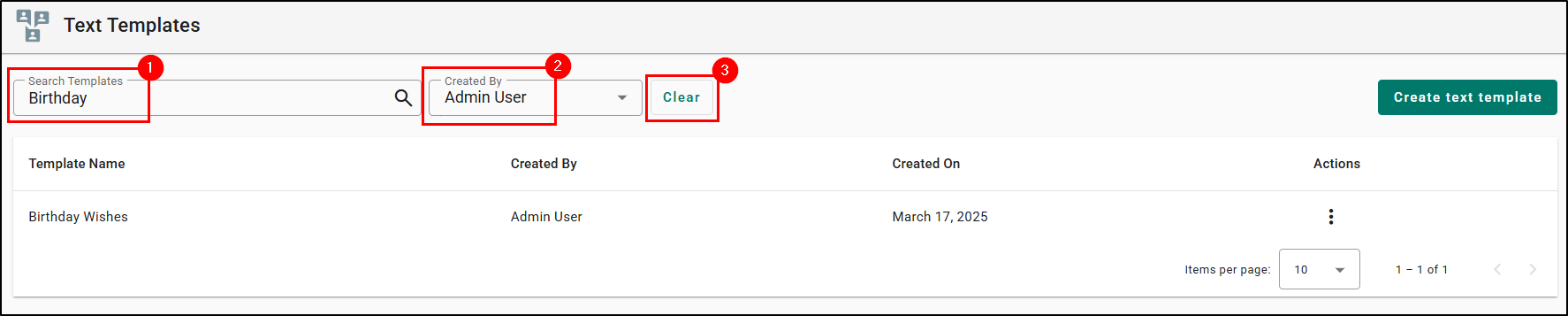 1. On the top-right of the Text Template page, select the Create Text Template button. This will take you to the new Create Text Template page.