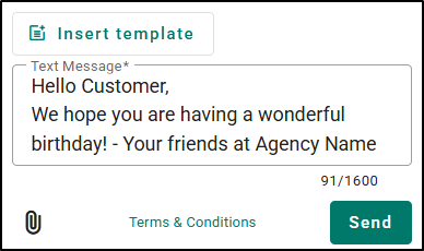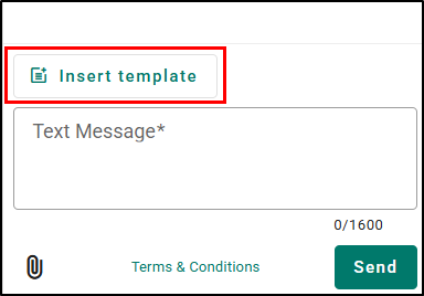 4. When ready, choose Select template on the bottom-right of the window. This will close the window and insert the template into the Text Messaging Pane. When you insert the template, the system already prefills in the information for any personalization tags in the system.