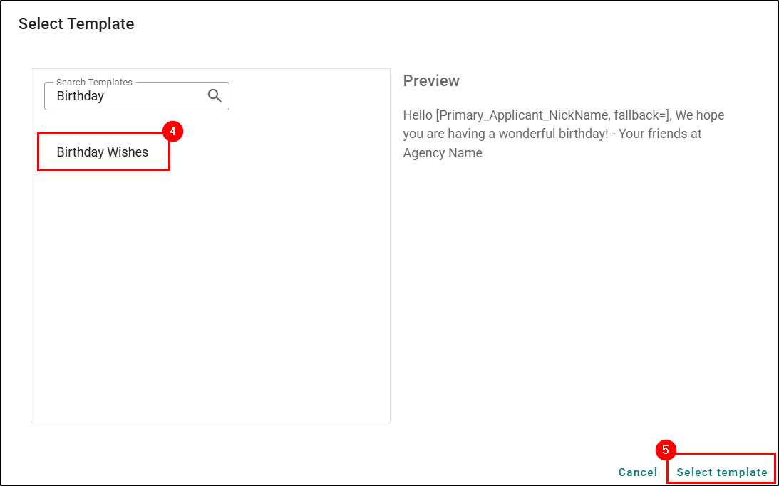 4. When ready, choose Select template on the bottom-right of the window. This will close the window and insert the template into the Text Messaging Pane. When you insert the template, the system already prefills in the information for any personalization tags in the system.