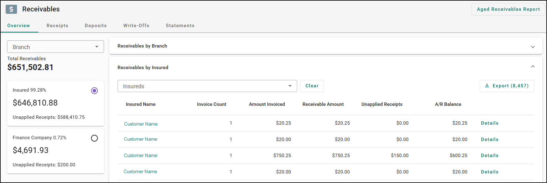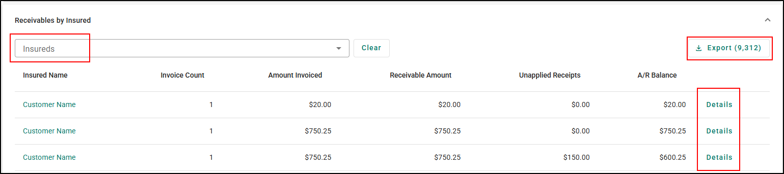 - Use the Export button to see a full list of all insureds associated with invoices that have open receivables