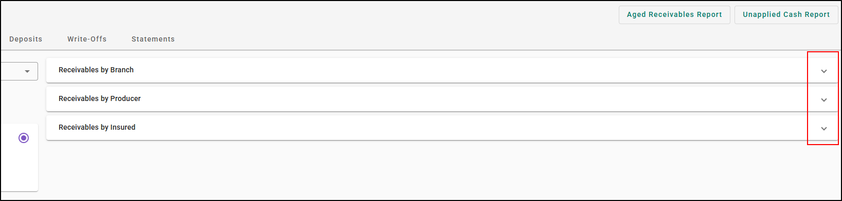 There are also separate tables that can be expanded to show the Receivables by Branch, Producer, or Insured. You can expand or minimize each table by using the arrows on the right.