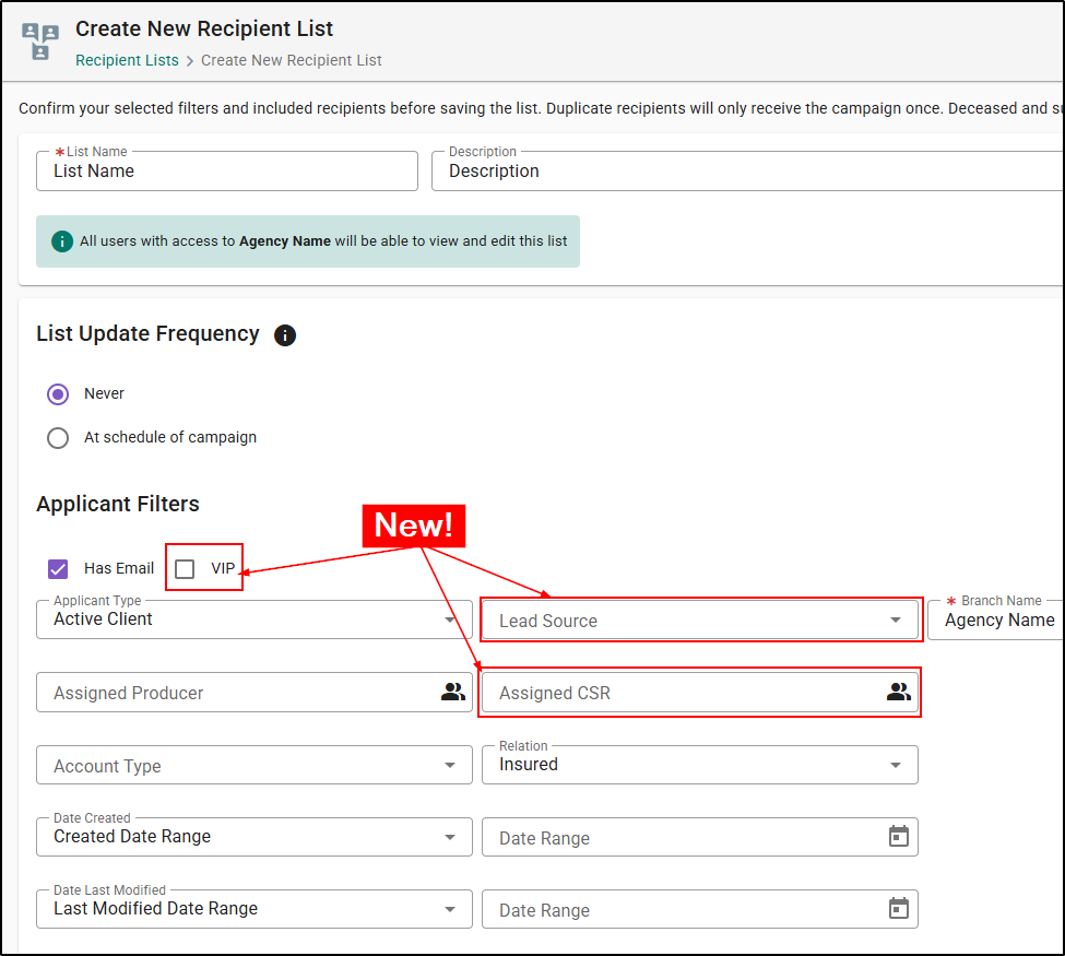 When you create a new Recipient List or edit an existing one, you'll find the new filter options available within the Applicant Filters and Policy Filters sections.
