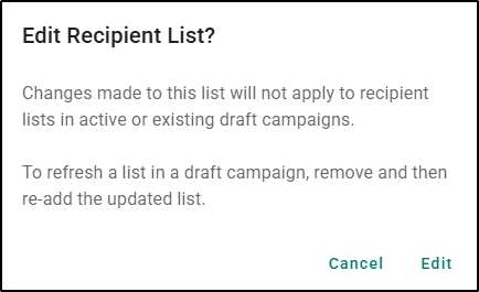 You can now edit the criteria of a previously saved recipient list, making updates quick and easy. When you choose to edit a list, you'll see an informative dialog box reminding you that "Changes made to this list will not apply to recipient lists in active or existing draft campaigns. To refresh a list in a draft campaign, remove and then re-add the updated list."