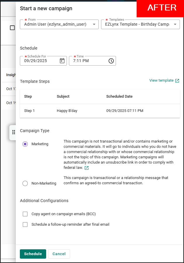 When creating a new campaign from the Sales Center Opportunities, Agency Insights, or the Applicant Overview page, you will now see a redesigned Campaign drawer panel instead of the old EZ4 pop-up modal.