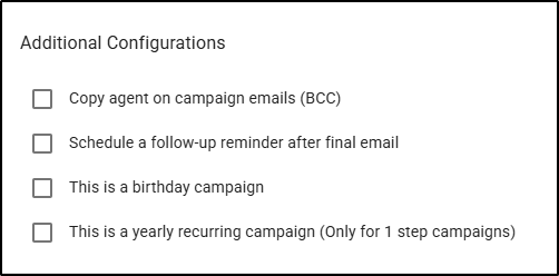 Underneath the Campaign Type section, you'll find an Additional Configurations section which includes the following options: