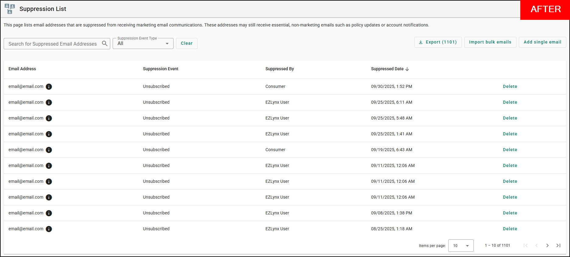 As part of the Email Campaigns Modernization, we've made some big improvements to the Suppression List page! These changes will help you manage your emails better and make sure they get to the right people. You'll have more control over who gets your emails, which helps you build stronger relationships with your clients.